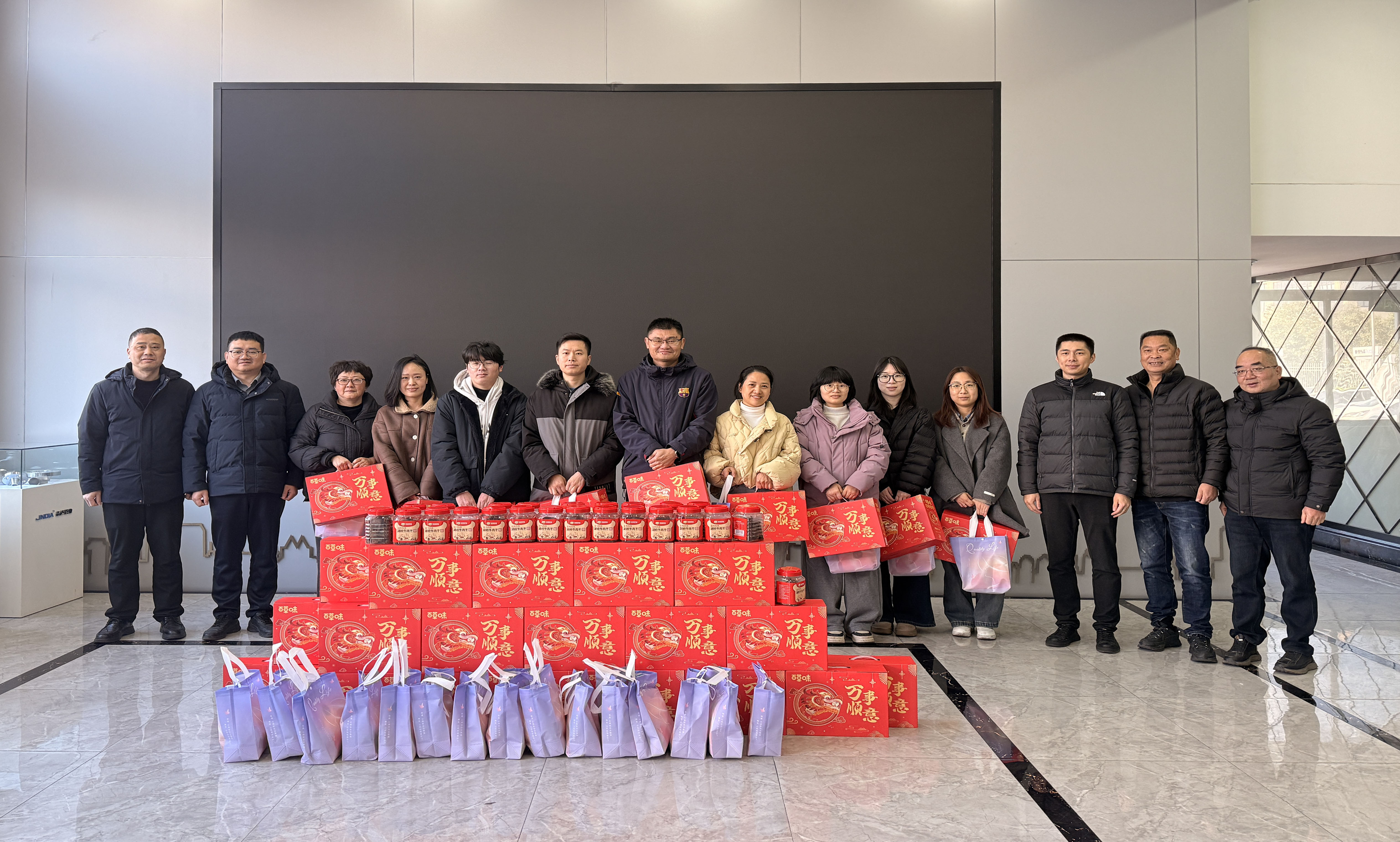 慰问现场温馨如家,笑语盈盈。街道与工会领导亲手将满载心意的新春礼包递到职工手中。礼包内悉心准备了全套洗漱用品、湖岭牛肉干、坚果等实用物资,点滴细节尽显体贴。姜苾雯副书记与员工们亲切交谈,细心询问大家的工作环境、生活近况与实际需求,言语间满是关切。